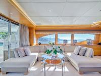 A 30m Ferretti Custom Line with immense interior space, flooded with light through large windows and a welcoming multi-functional shaded sundeck ideal for lounging and dining. She sleeps up to 12 guests in her 5 cabins: a Master Cabin on Main Deck with en-suite facilities, King-size Bed, dressing table, walk in wardrobe and safe, Two Double Cabins with Queen size beds on the lower deck, with walk-in wardrobe and safe, en-suite facilities and a tub with Jacuzzi in one of the double cabin bathrooms and two Twin Guest Cabins with large hull windows, opening port holes, dressing table and en-suite facilities. Heated Floors and mirror anti-fog feature in all bathrooms. Additional highlights include the zero speed stabilizers for extra comfort at anchor, a huge beach platform and a brand new, wide list of toys to include a jet ski and 2 seabobs. A 37' Axopar (2020) can be rented as a chase boat at extra cost.