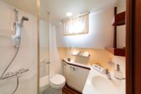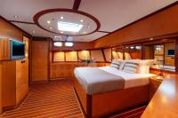 SERENITY 86 is a sleek and modern motorsailer that was launched in 2007 and has been well maintained to remain in brand new condition. Her light colour wooden interior finish is supported by spa like white bathrooms to provide a very airy and soothing ambience. Glossy mahogany strips and shiny stainless steel framing are tastefully integrated on the white coloured exterior. One of the unique distinctions of this yacht is that the quality of sound insulation used together with the fact that the generators and ventilation systems have been position far away from the cabins means that almost no noise or vibration can be heard while the air-conditioning is running. With a very comfortable aft dining area, bimini covered forward deck and a flybridge that can easily sit eight guests, this vessel offers no less exterior space than one would find in motor yachts along the 30m range. The yacht is equipped with all the modern amenities and games as well as a generous range of water sports. Serenity 86 is also a great option for guests who like to open sails to enjoy quiet crossings and take in the views.